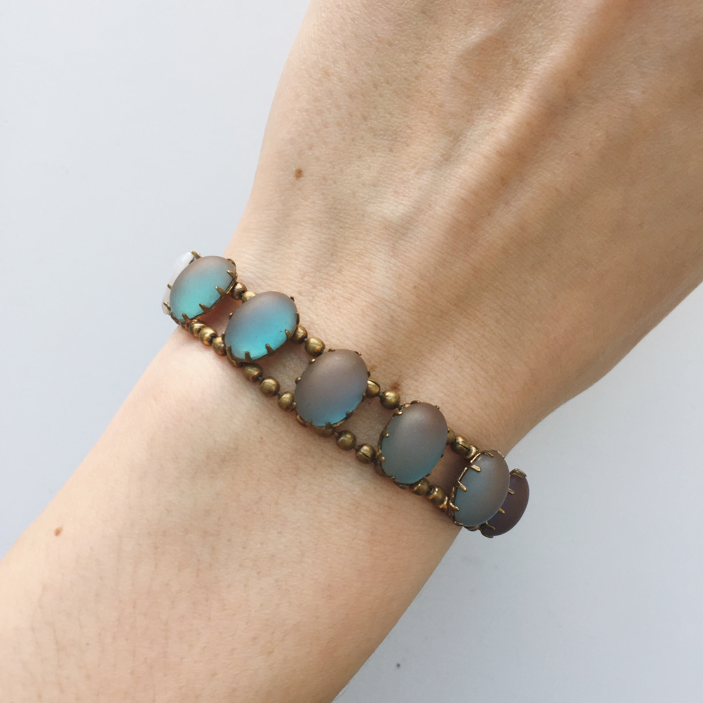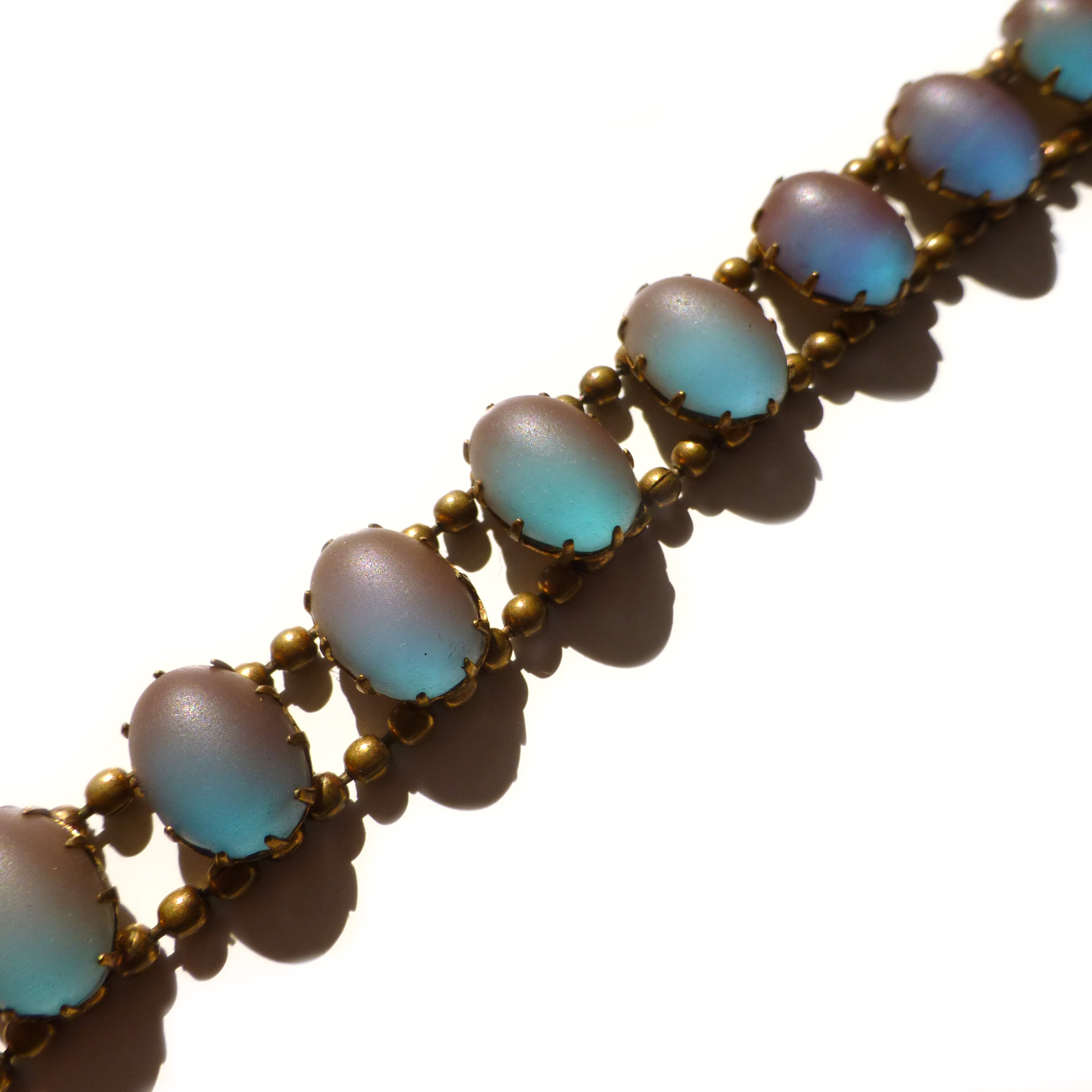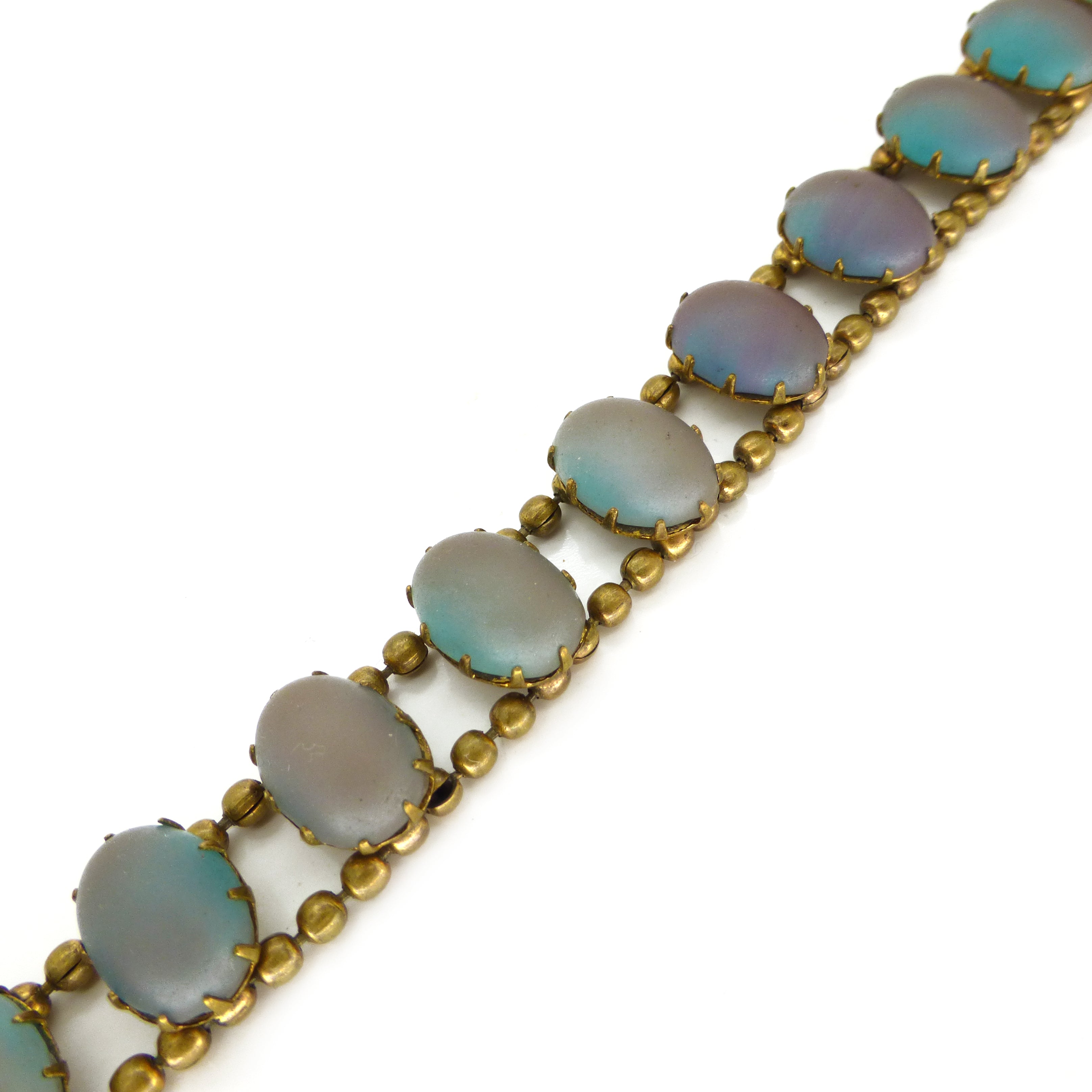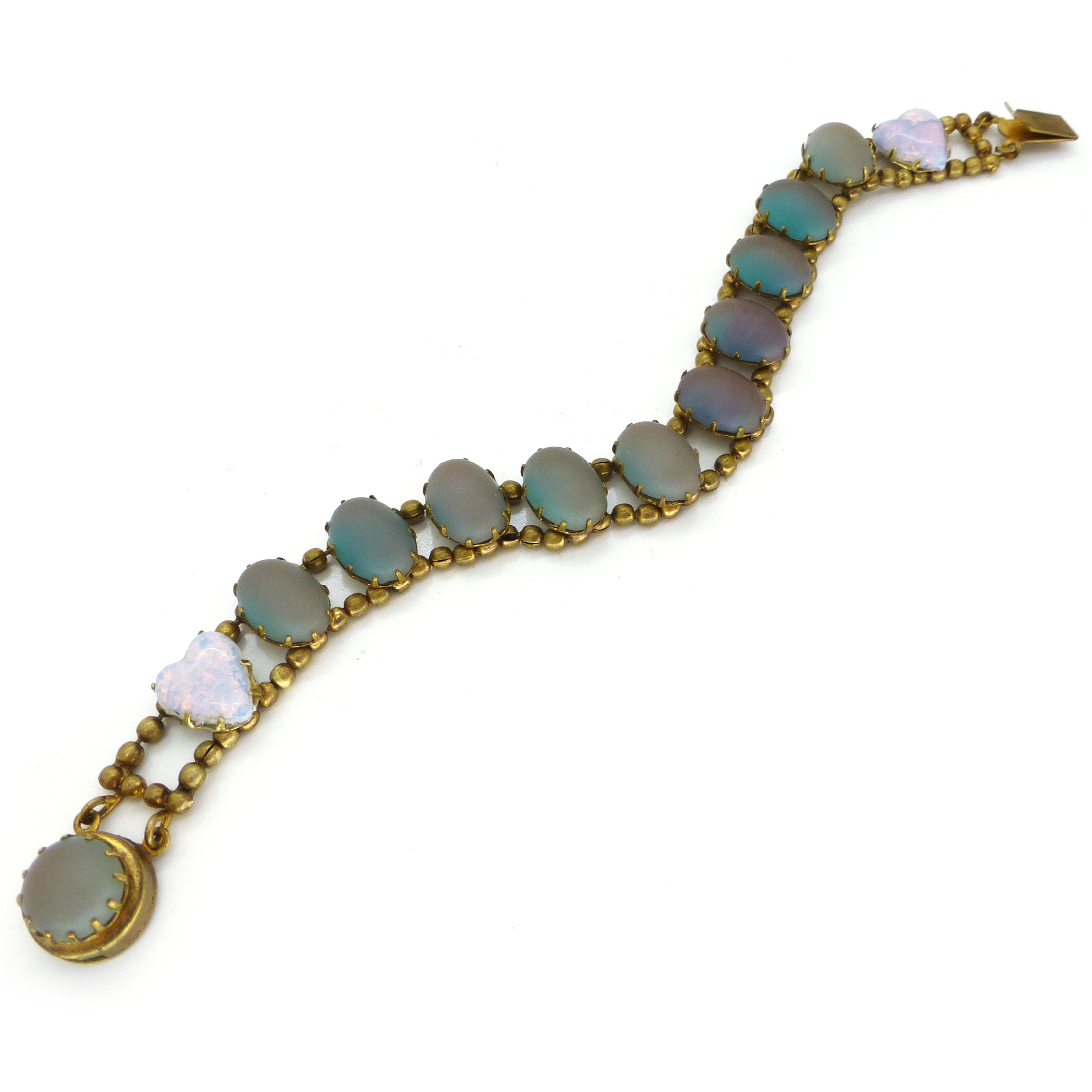 A beautiful antique bracelet set with saphiret glass cabochons and two little opalescent hearts. The bracelet is finished with a secure push clasp.