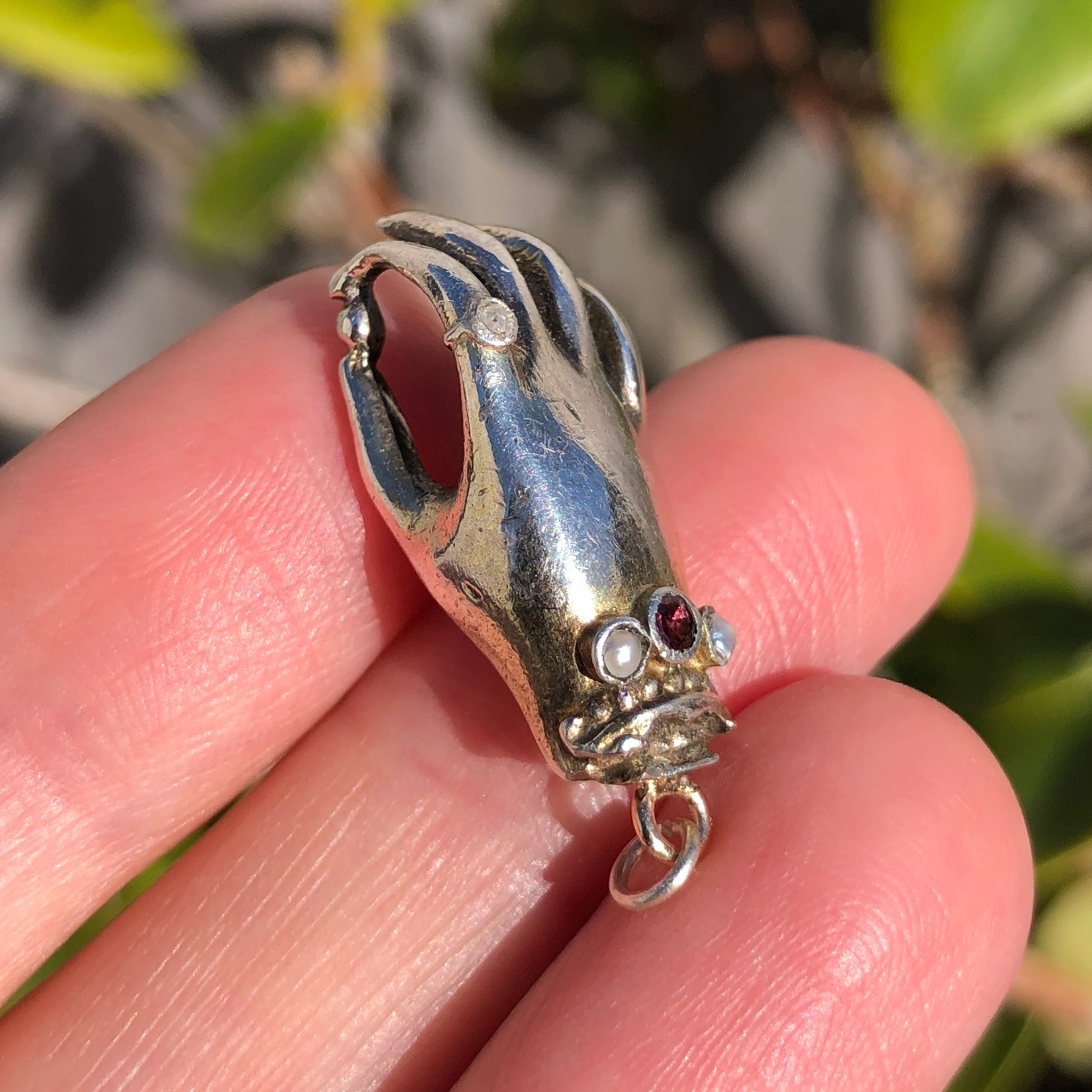 The charm is not hallmarked but is solid silver and features a 9ct gold hook. The hand is English in origin and dates to the late 19th Century.