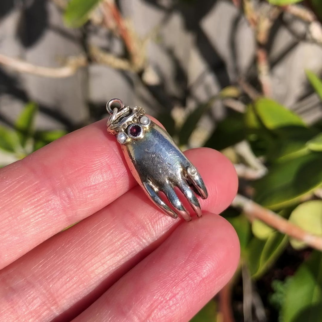 A beautiful silver hand charm that has been converted from an antique stick pin.