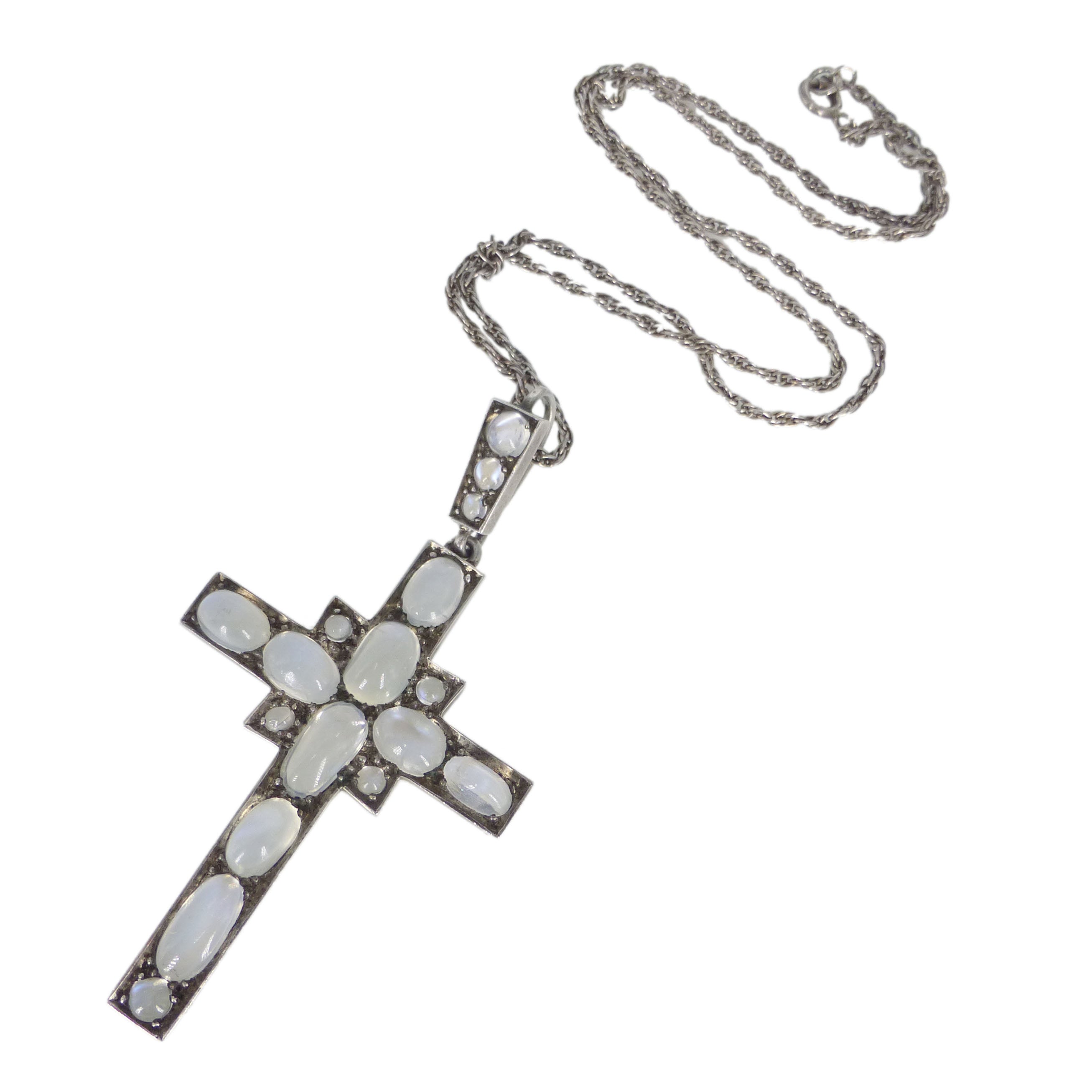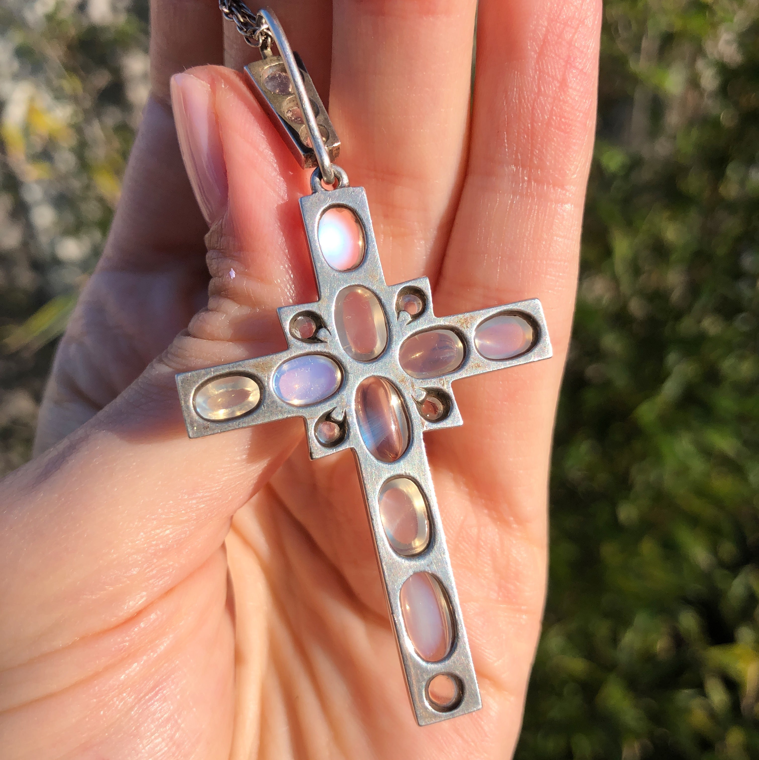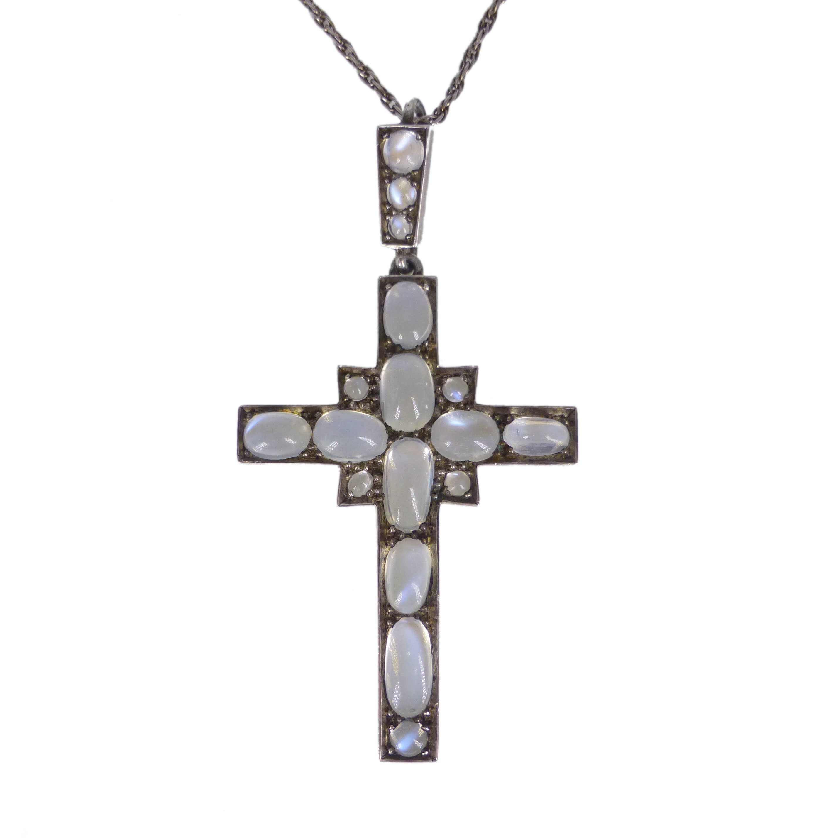 An exceptional antique silver cross pendant set with some of the most beautiful moonstones I have ever seen.