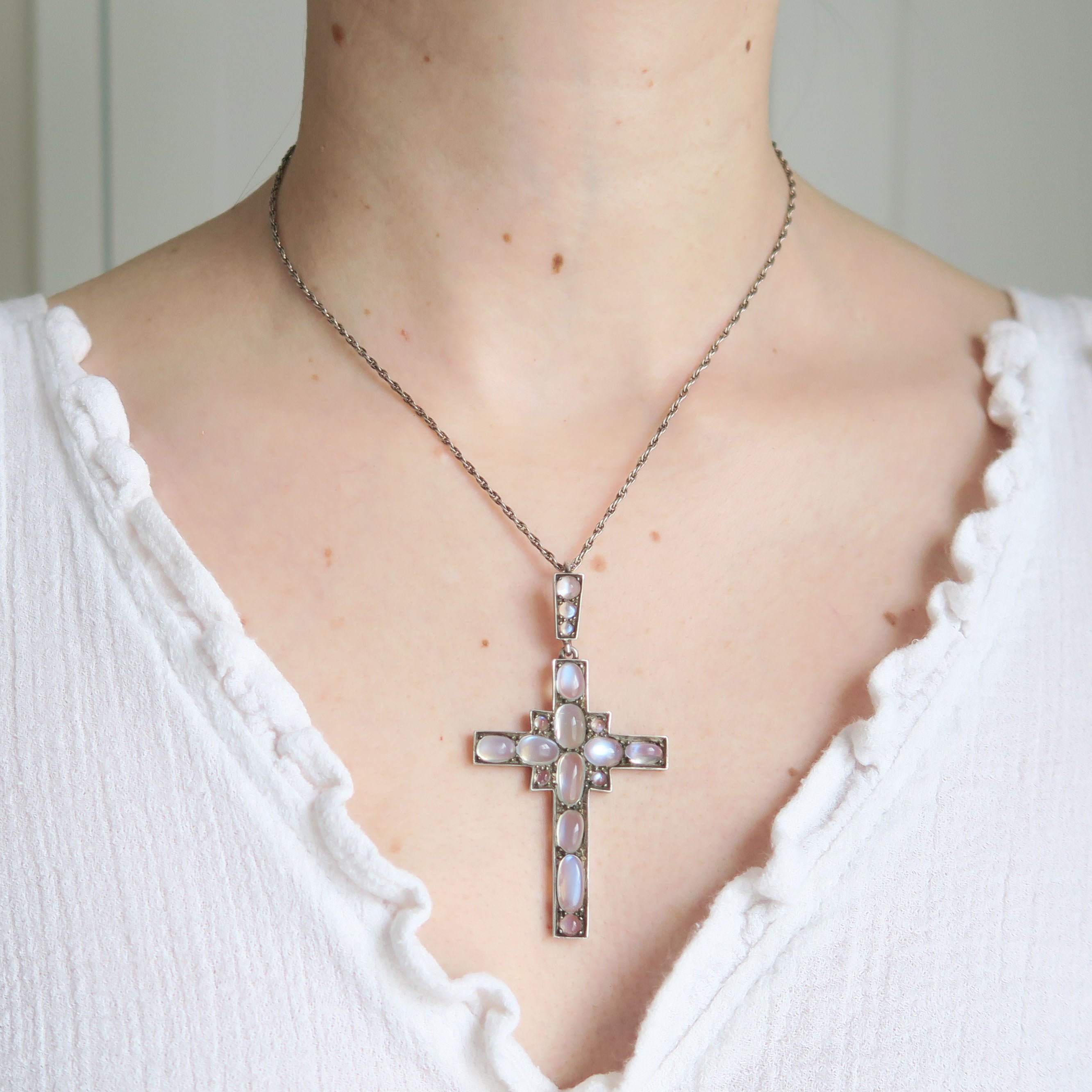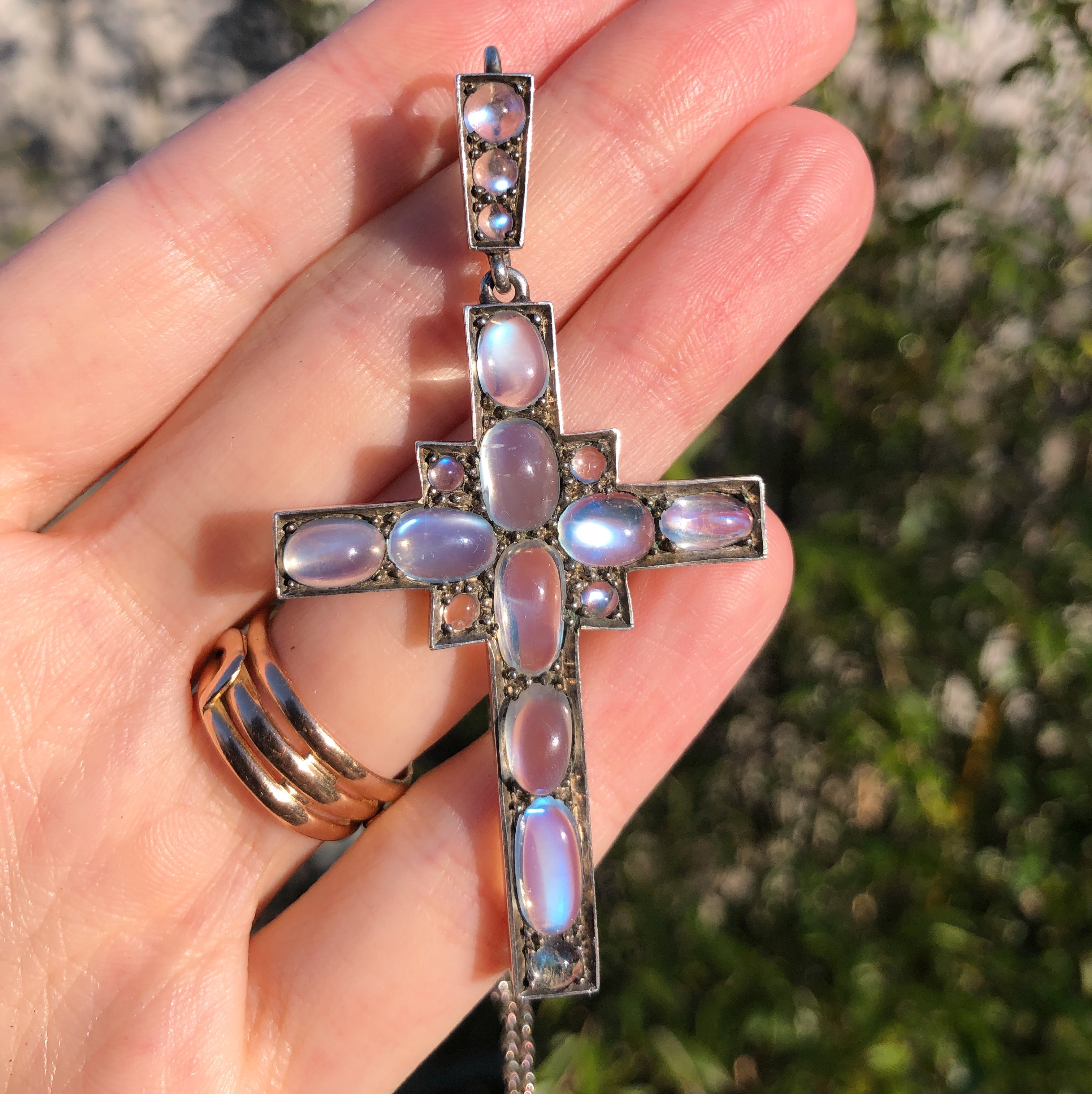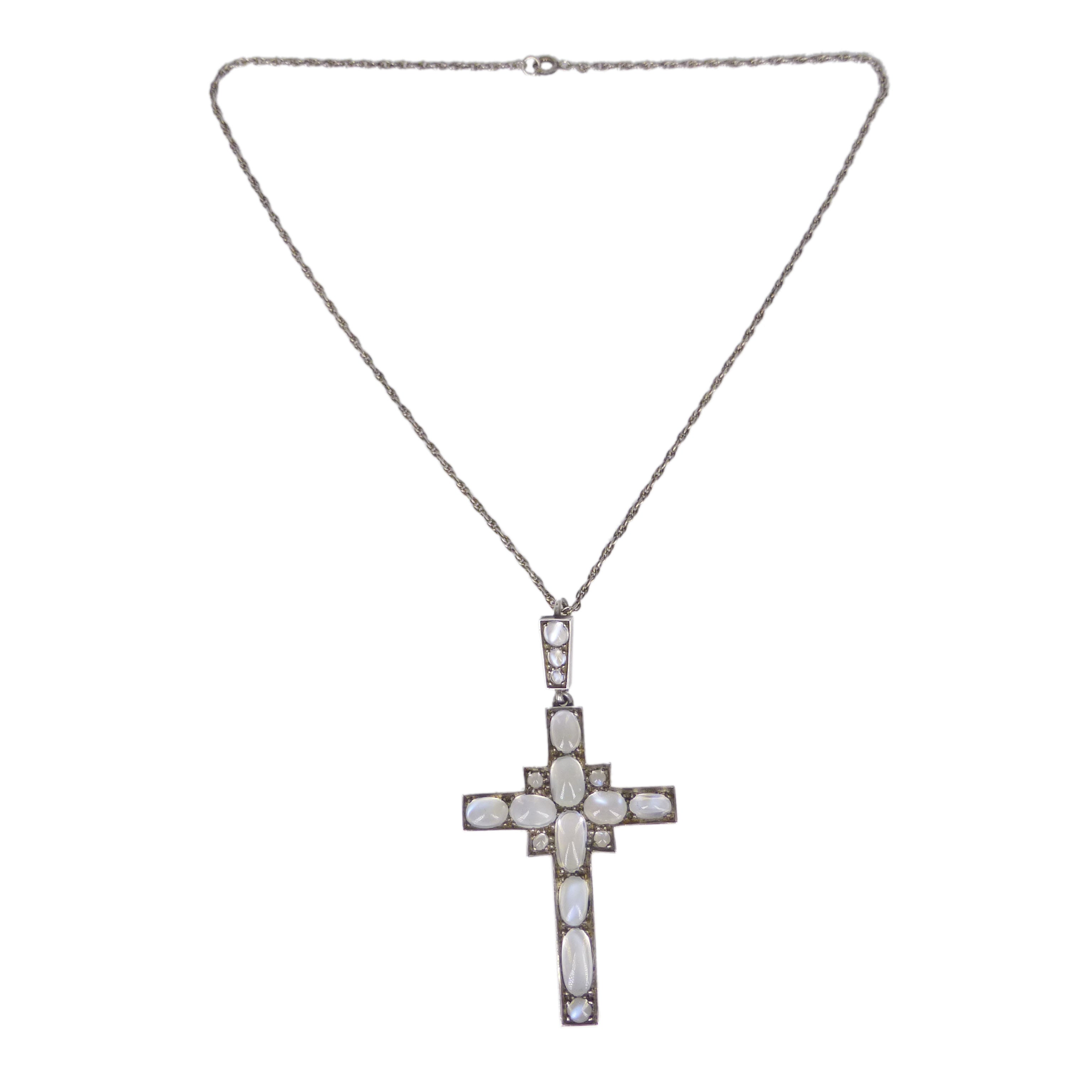 An exceptional antique silver cross pendant set with some of the most beautiful moonstones I have ever seen.