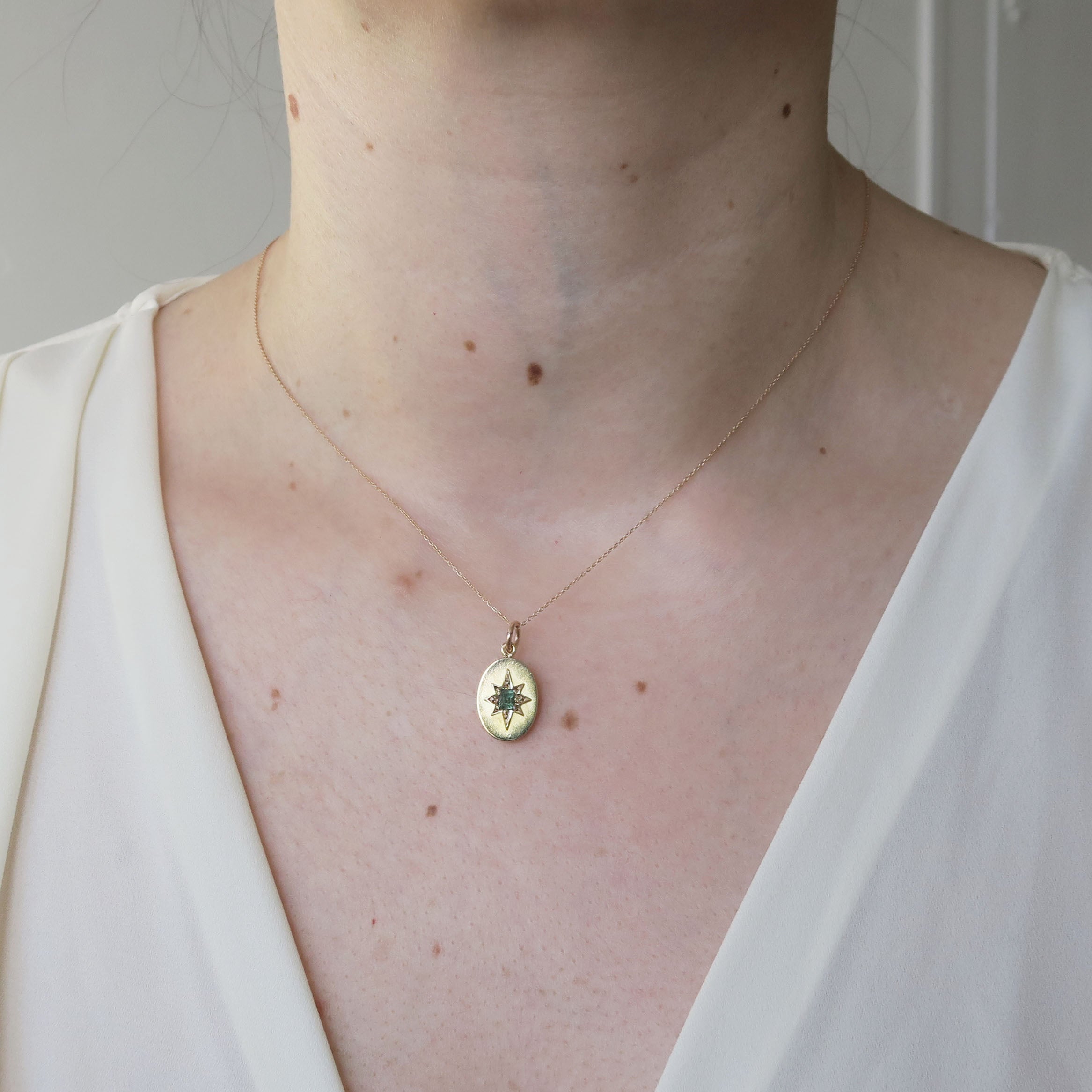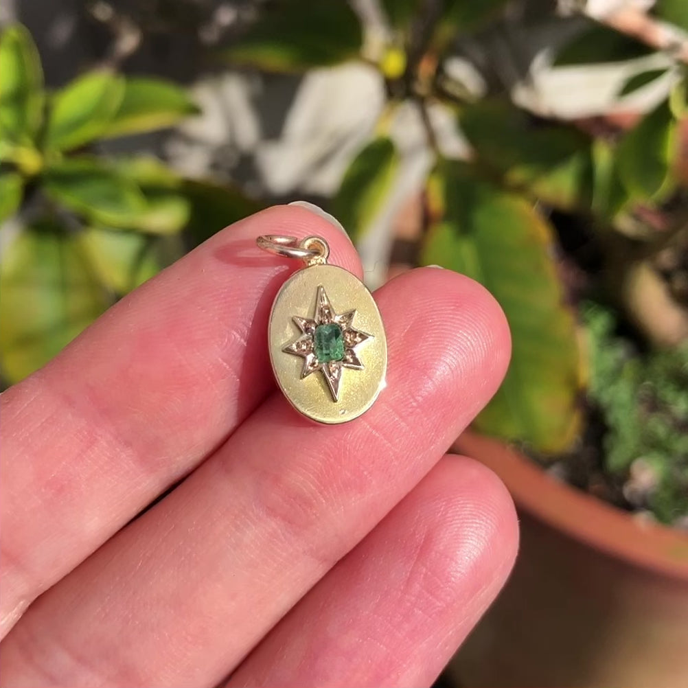 The oval shaped charm features a raised star at its centre set with a beautiful green emerald stone.