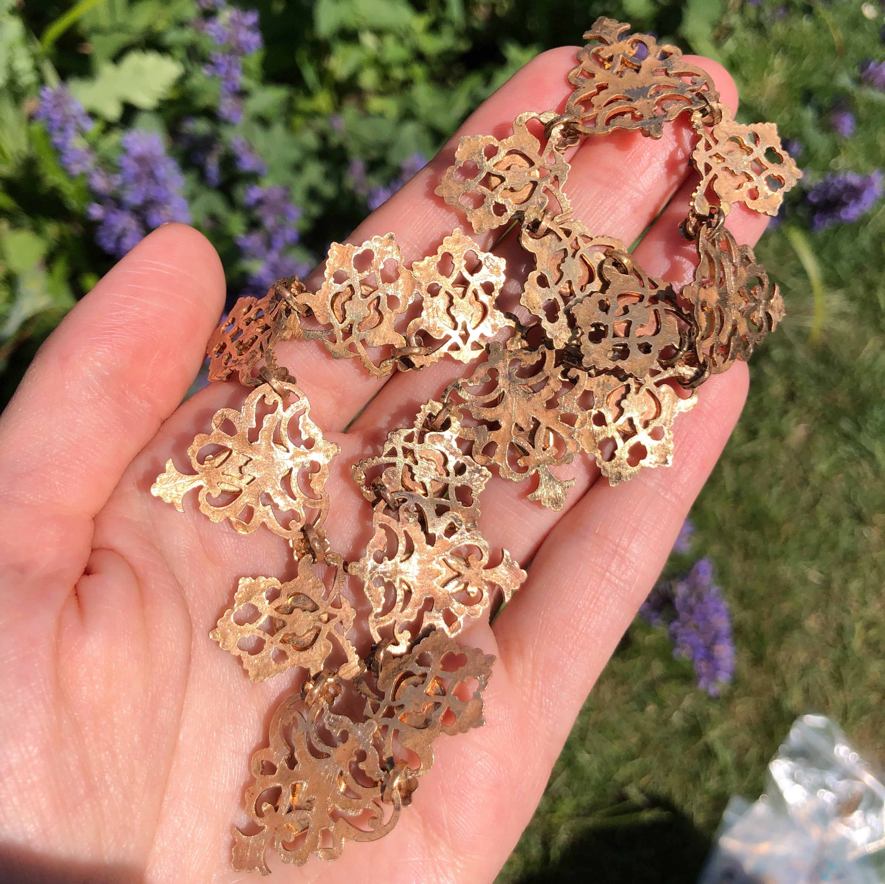 There is some age related wear to the base of some of the metal panels. The necklace remains in good antique condition overall.