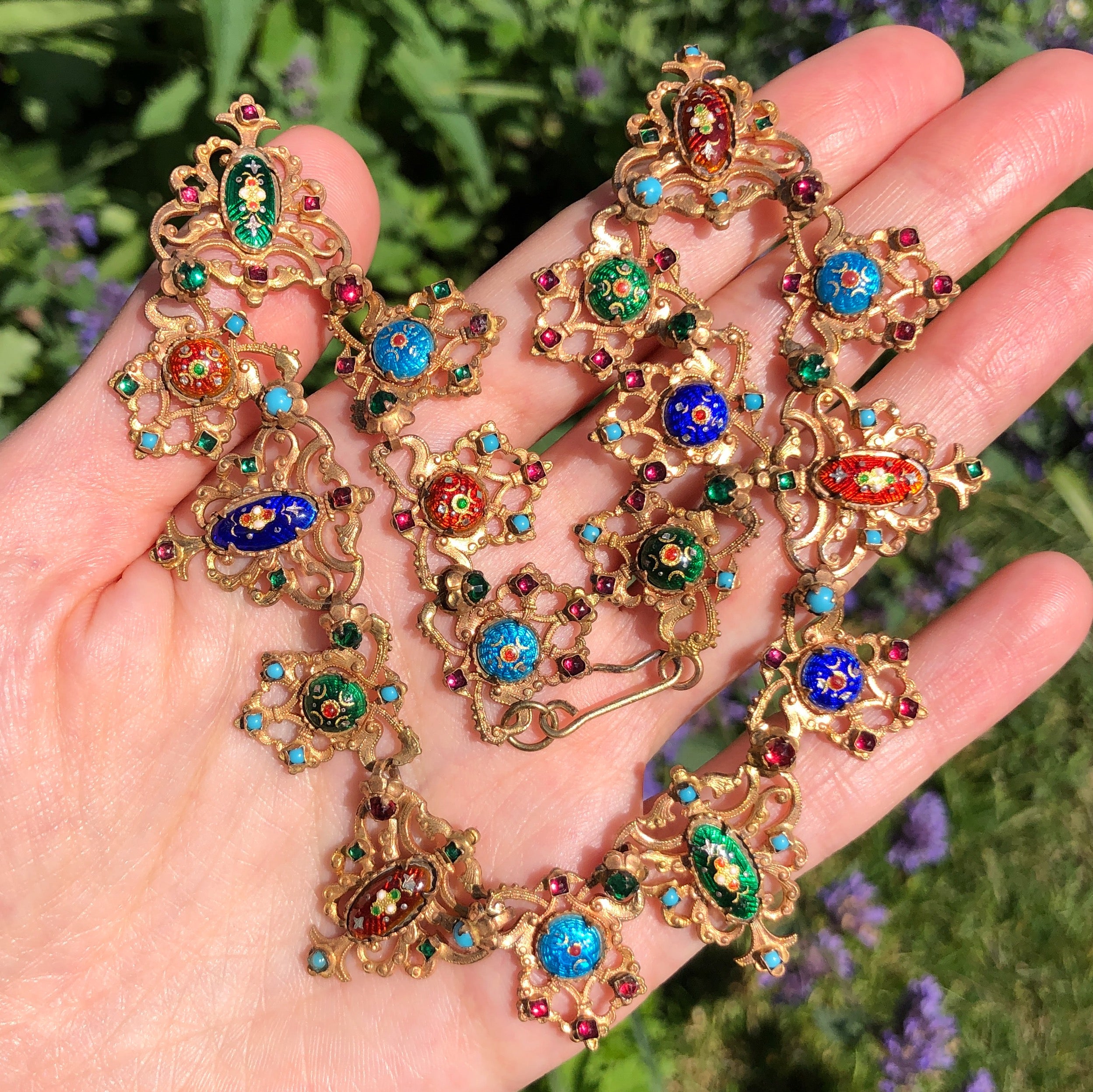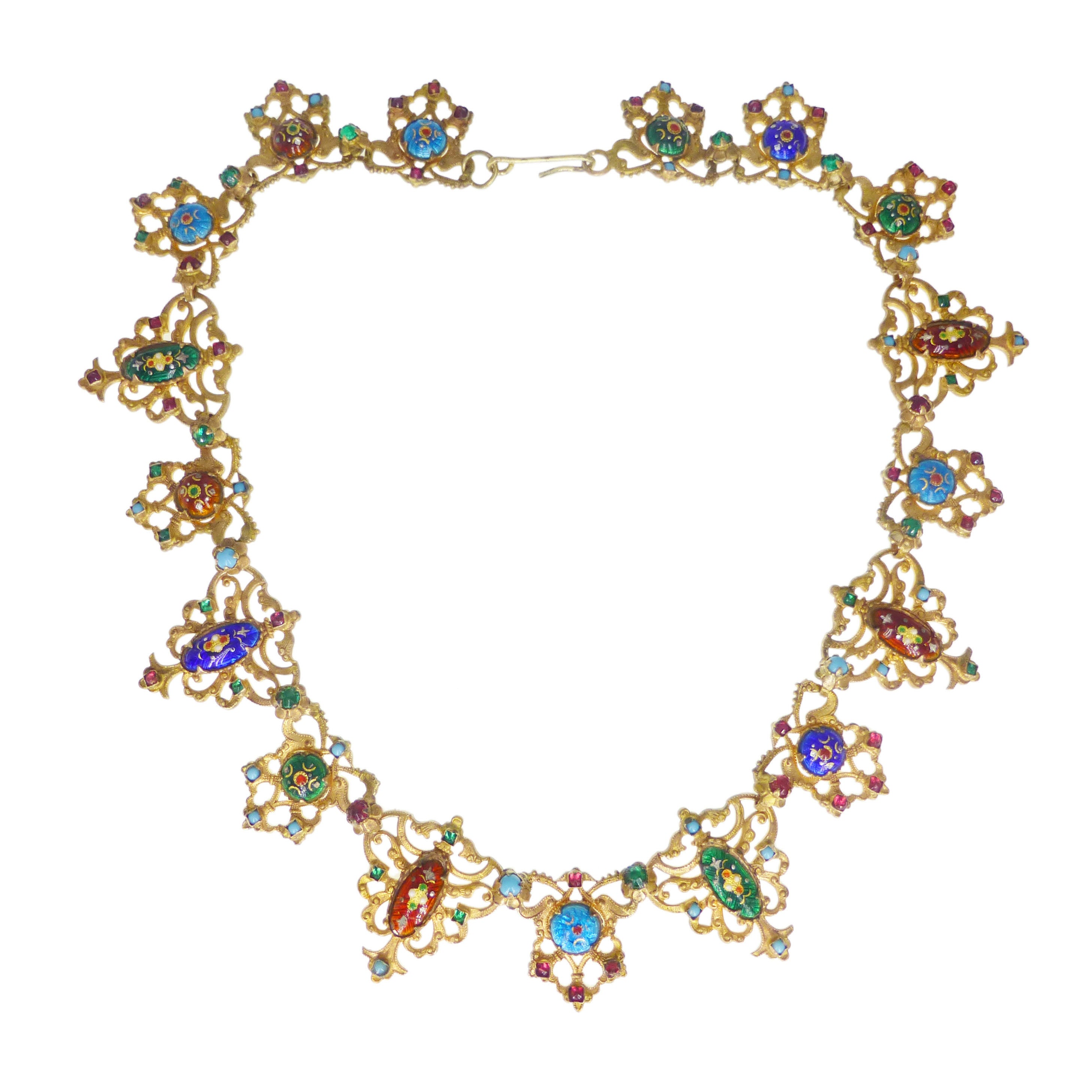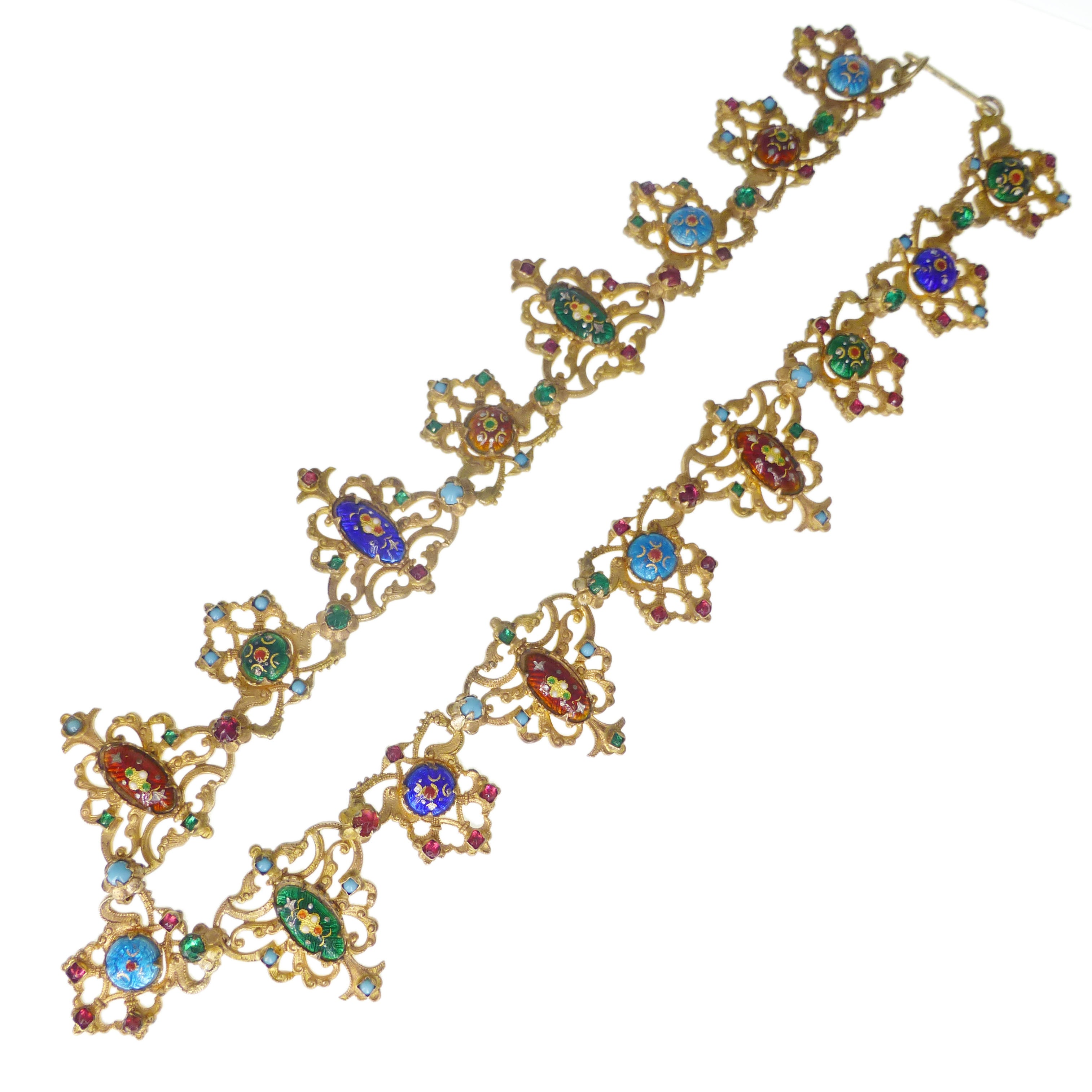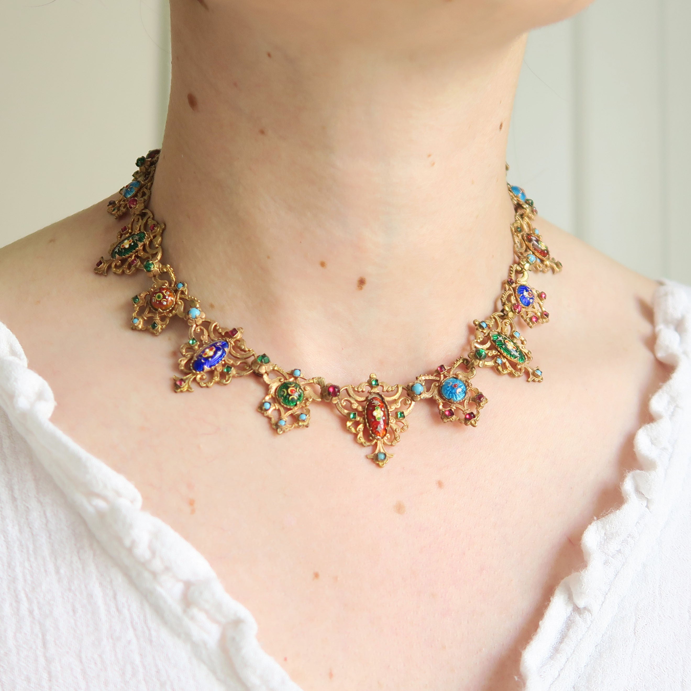 A wonderful antique Victorian gold metal necklace featuring beautiful jewel toned Bressan enamel (emaux bressans) panels.
