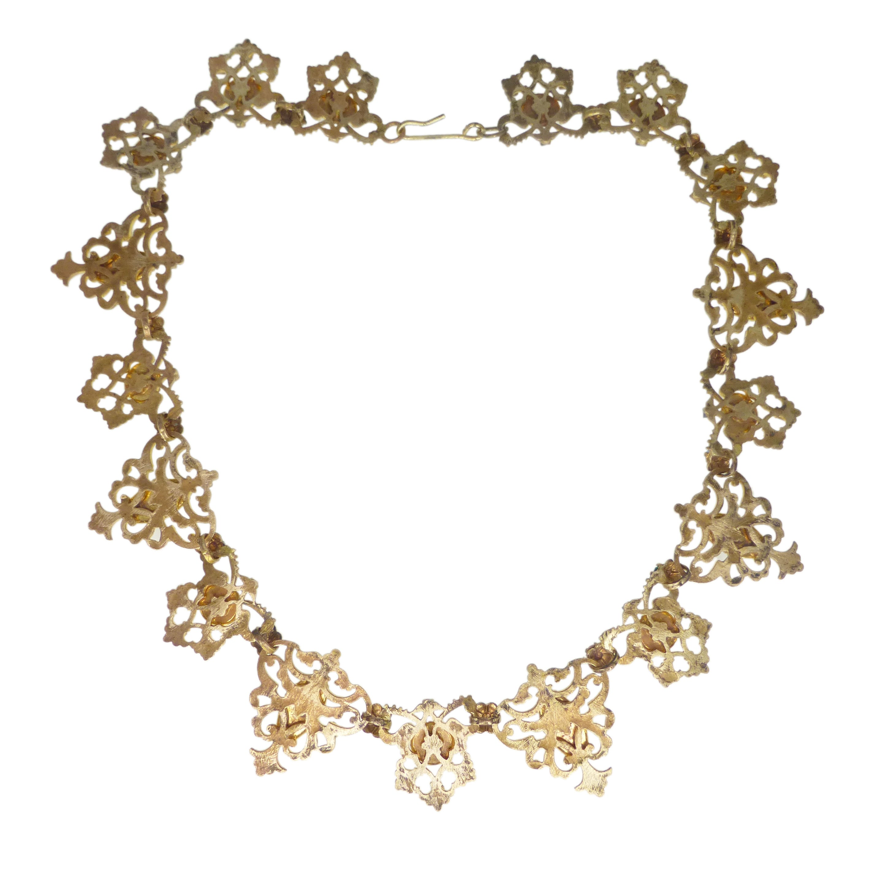 The necklace features openwork brass panels, each set with a bressan enamel plaque. The panels are linked by decorative floral bales with tiny glass jewels framing each design.