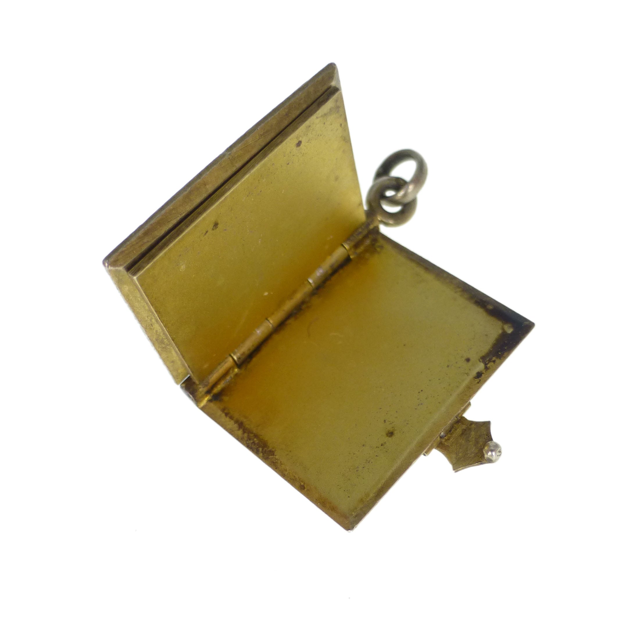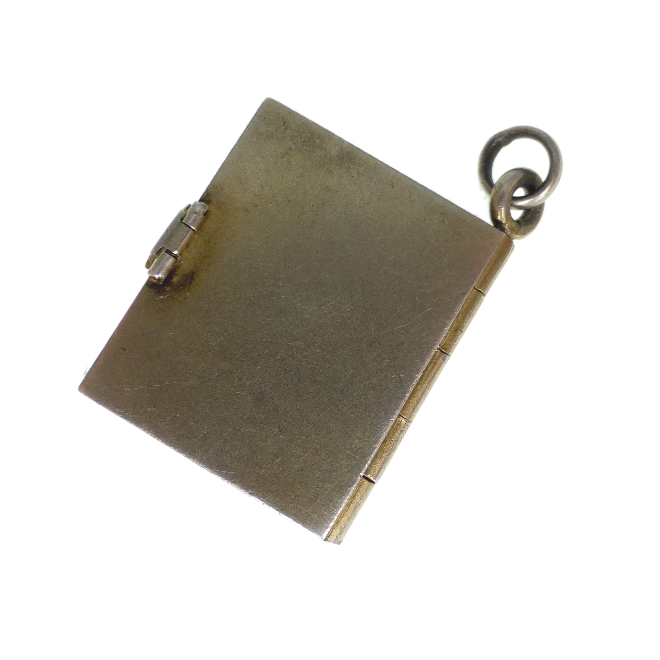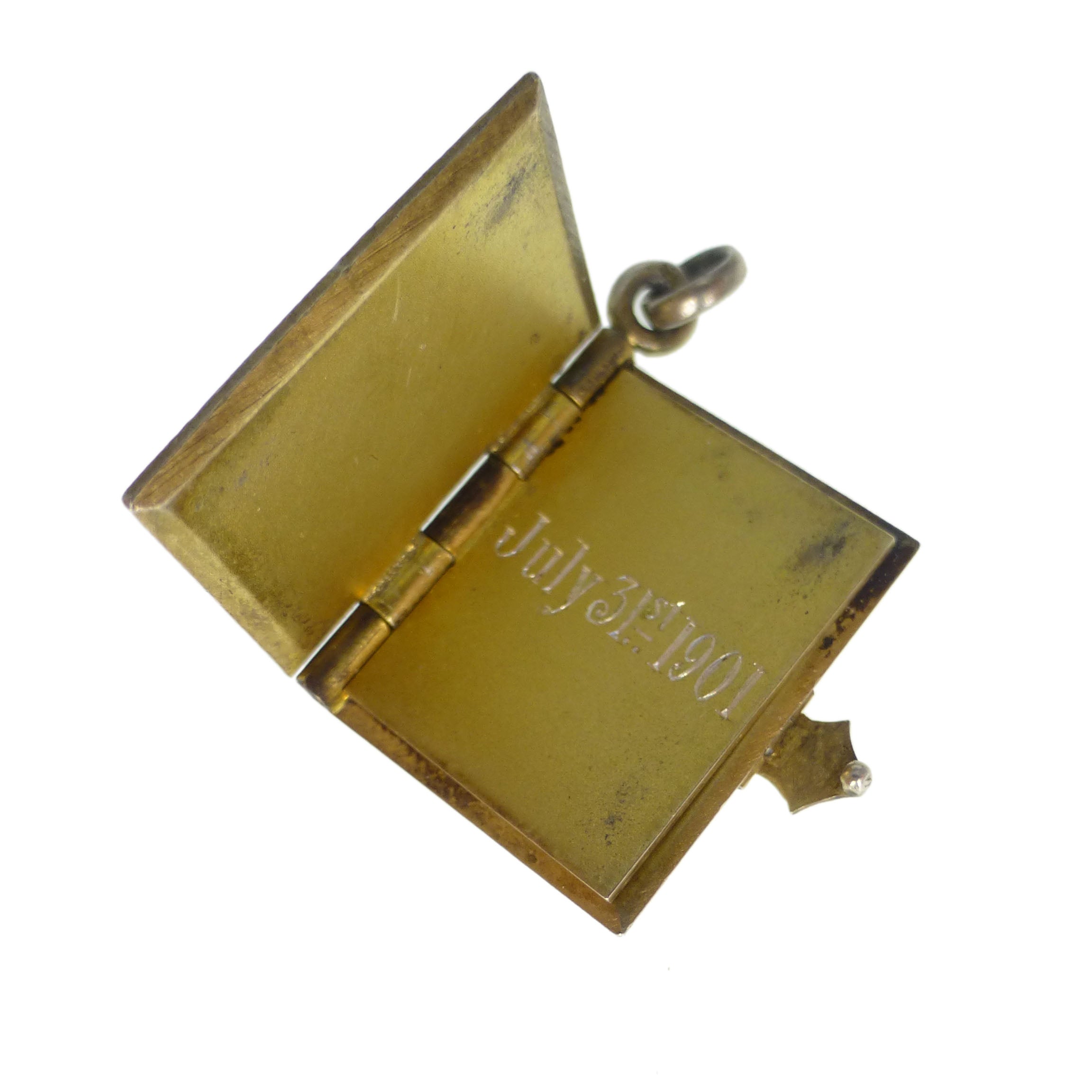 A charming antique silver book locket featuring a beautifully enamelled front. The book opens to reveal a page engraved with the date 'July 31st 1901'.