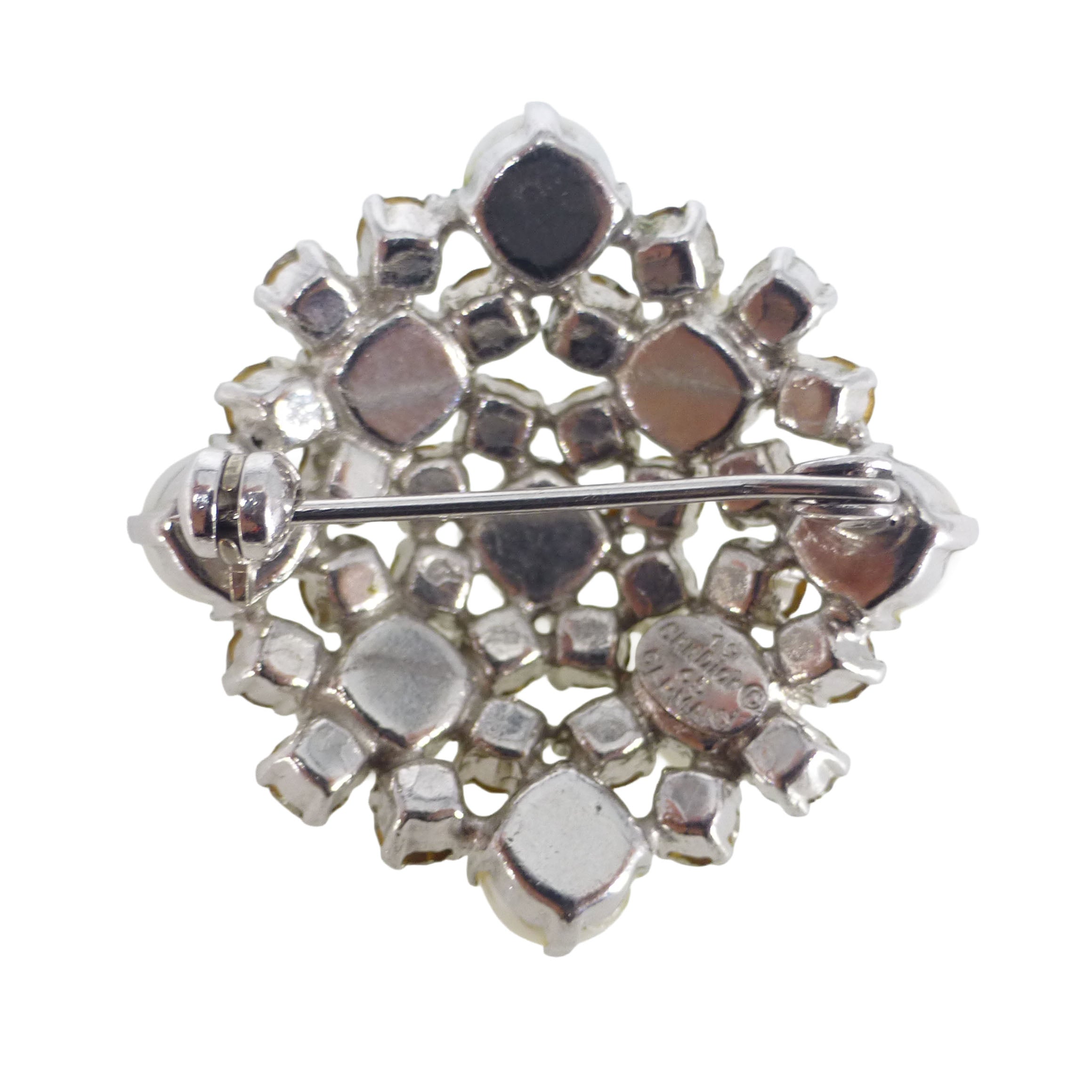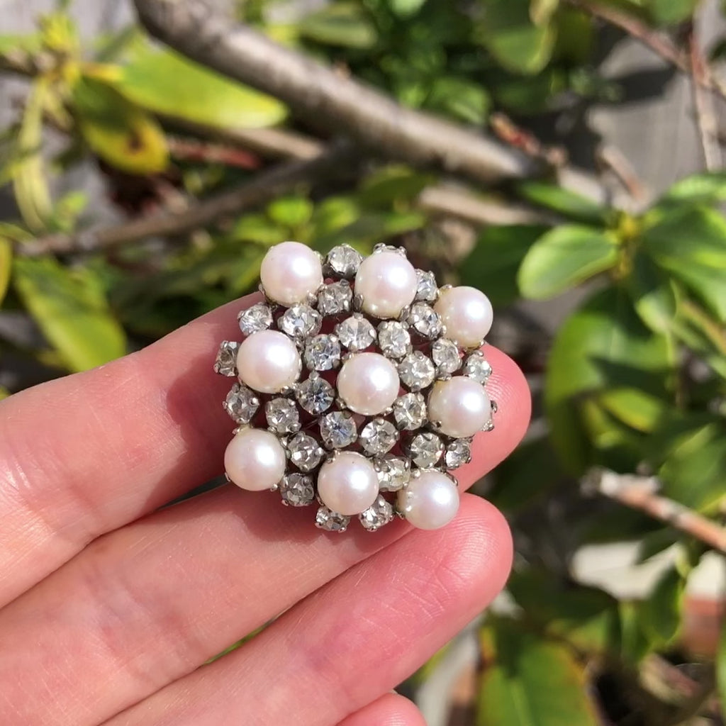 A beautiful vintage Christian Dior brooch featuring a cluster faux pearls and clear paste stones.