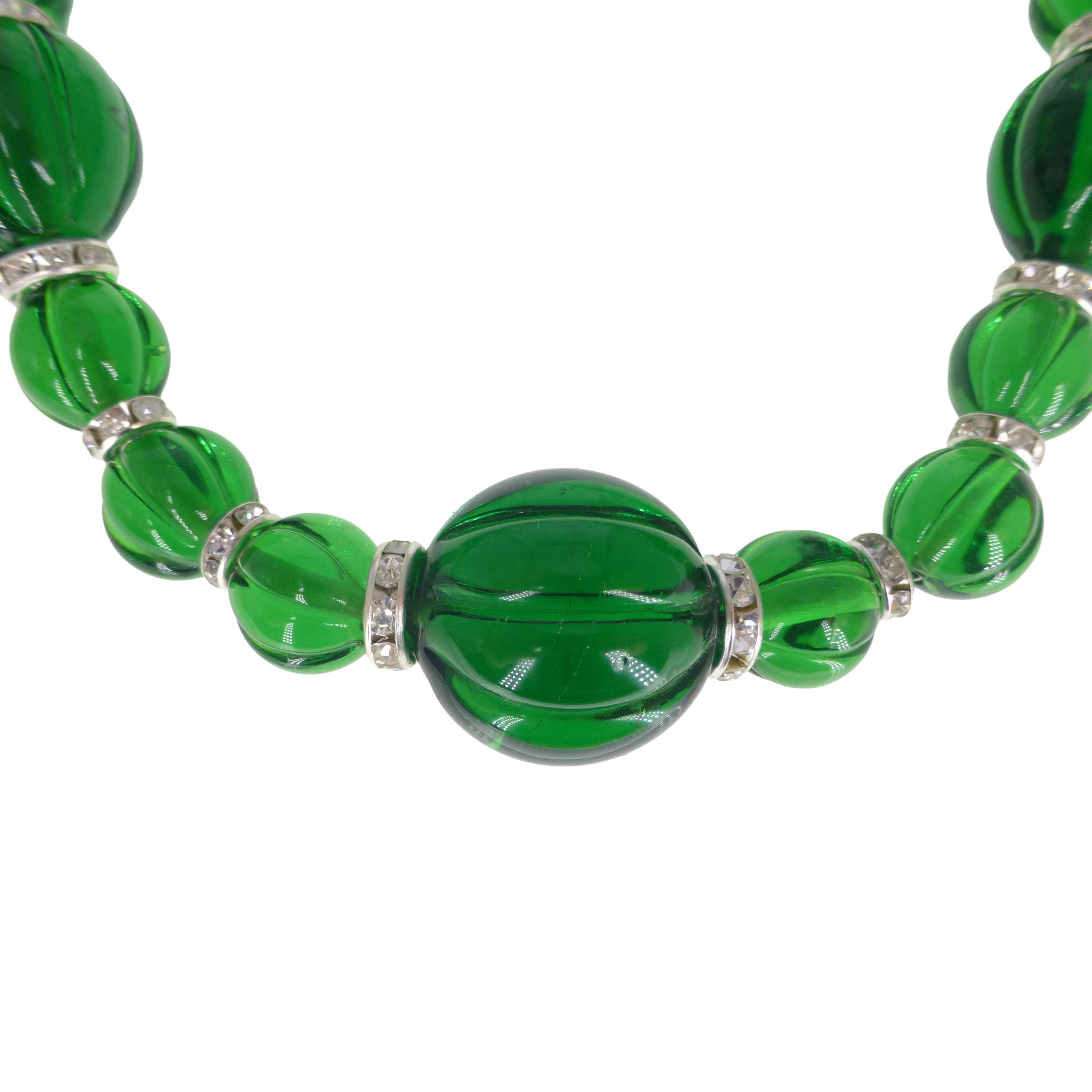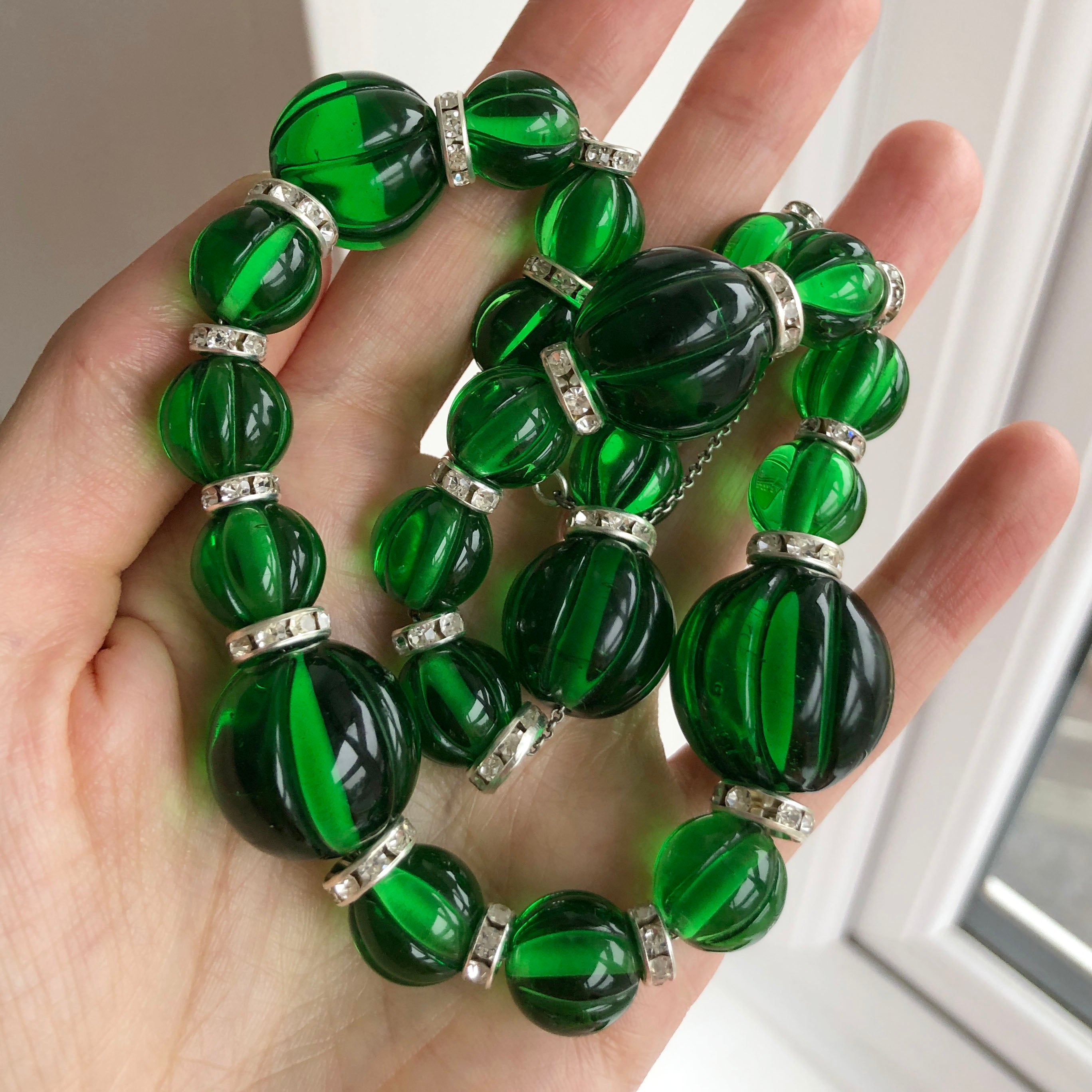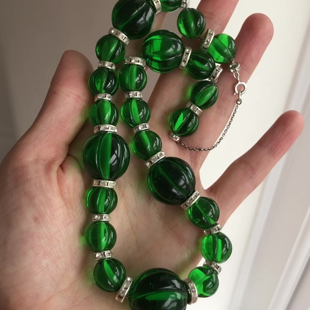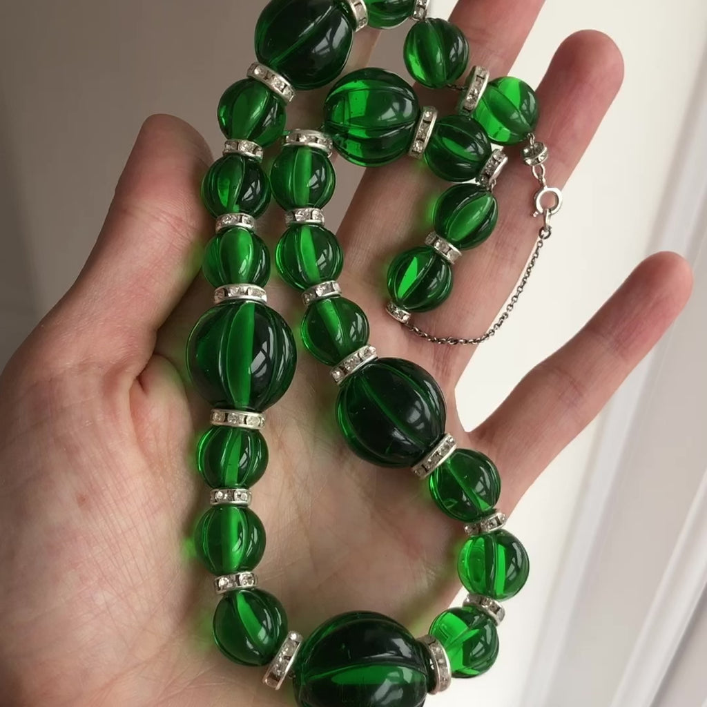 Each melon bead is beautifully ridged in a lovely deep green colour. The beads have been strung onto an antique silver chain and set with little paste rondelles in between.